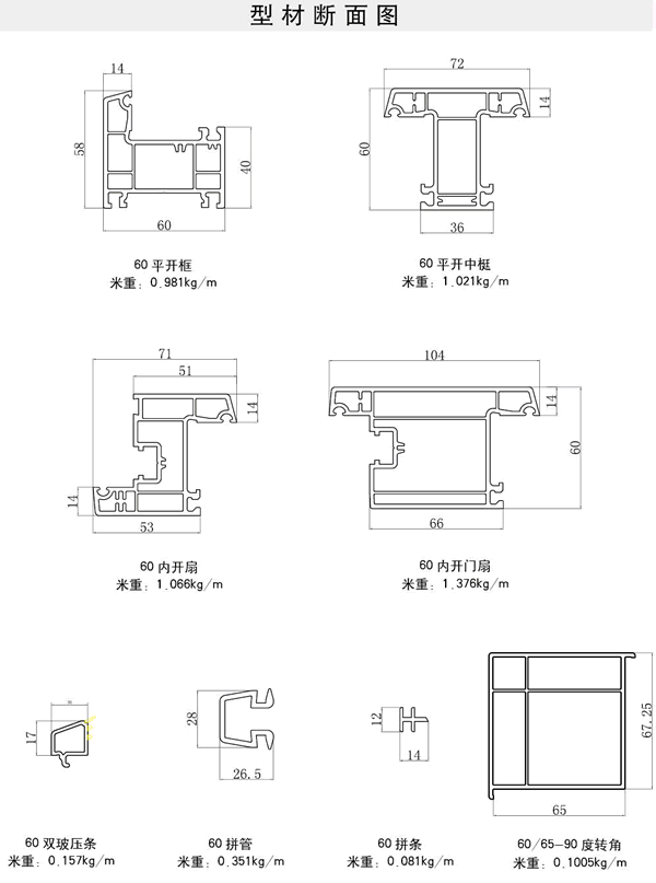 型材斷面設計合理 1、60系列主型材采用三腔結構,設有獨立排水腔、增強型鋼腔、保溫隔音腔,使熱傳導K值在2.0以下。 2、合理的斷面設計相應增大了X軸慣性距,使負荷性能明顯提高。 3、斷面的三道密封設計,使窗的氣密性、水密性、隔音性大大提高,完全滿足嚴寒地區(qū)用戶需求。